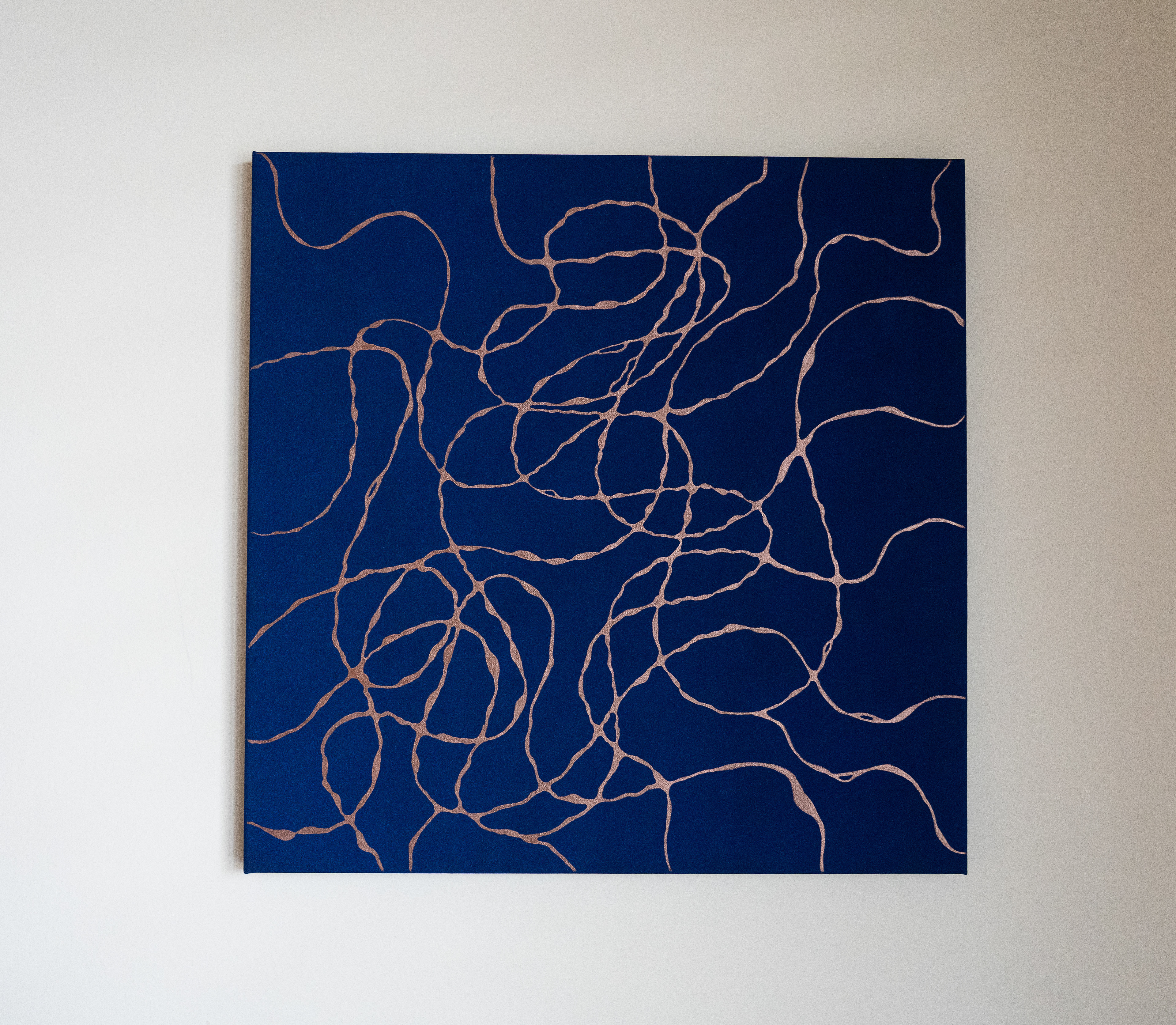 Medium: Prussian blue velvet acrylic gouache on canvas, carefully applied to create an authentic velvet look & feel, with neuro-lines in copper oil marker, both of Japanese origin