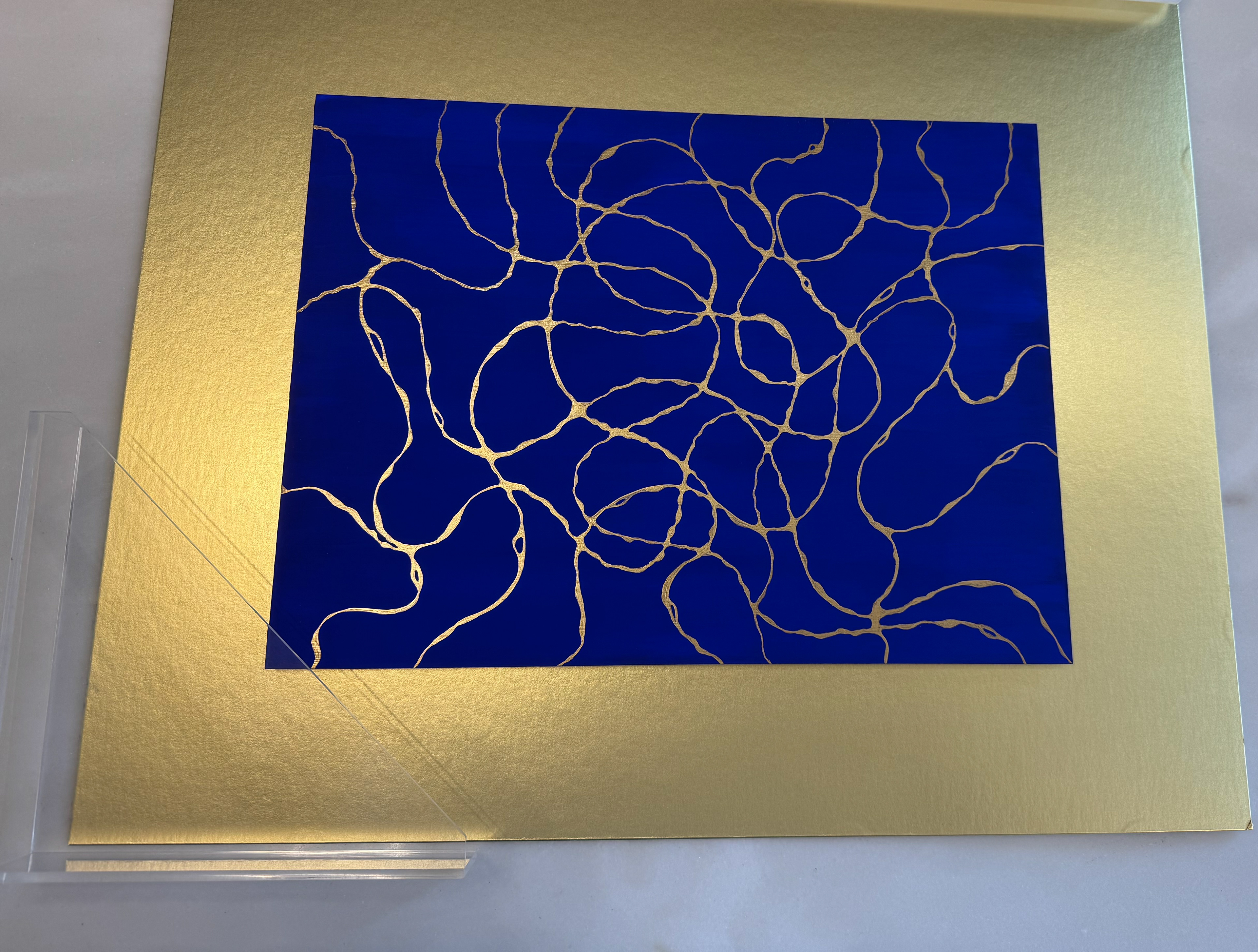 Medium: Ultramarijn acryl gouache op ampersand hardboard met neurolijnen in gouden acrylmarker