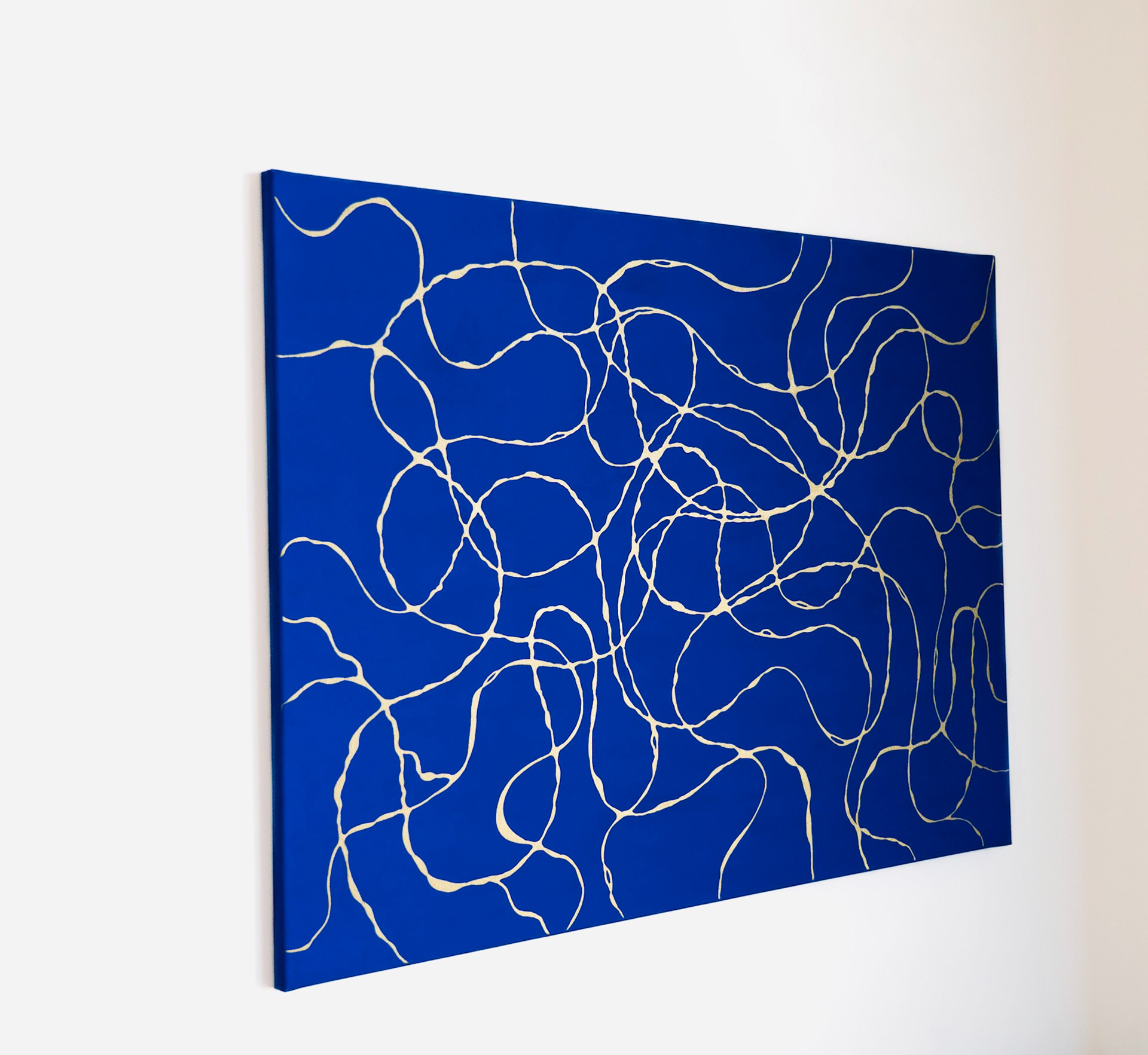 Medium: Ultramarine velvet acrylic gouache on canvas, specifically applied to create a true velvet look & feel, with neuro-lines in Japanese golden oil marker