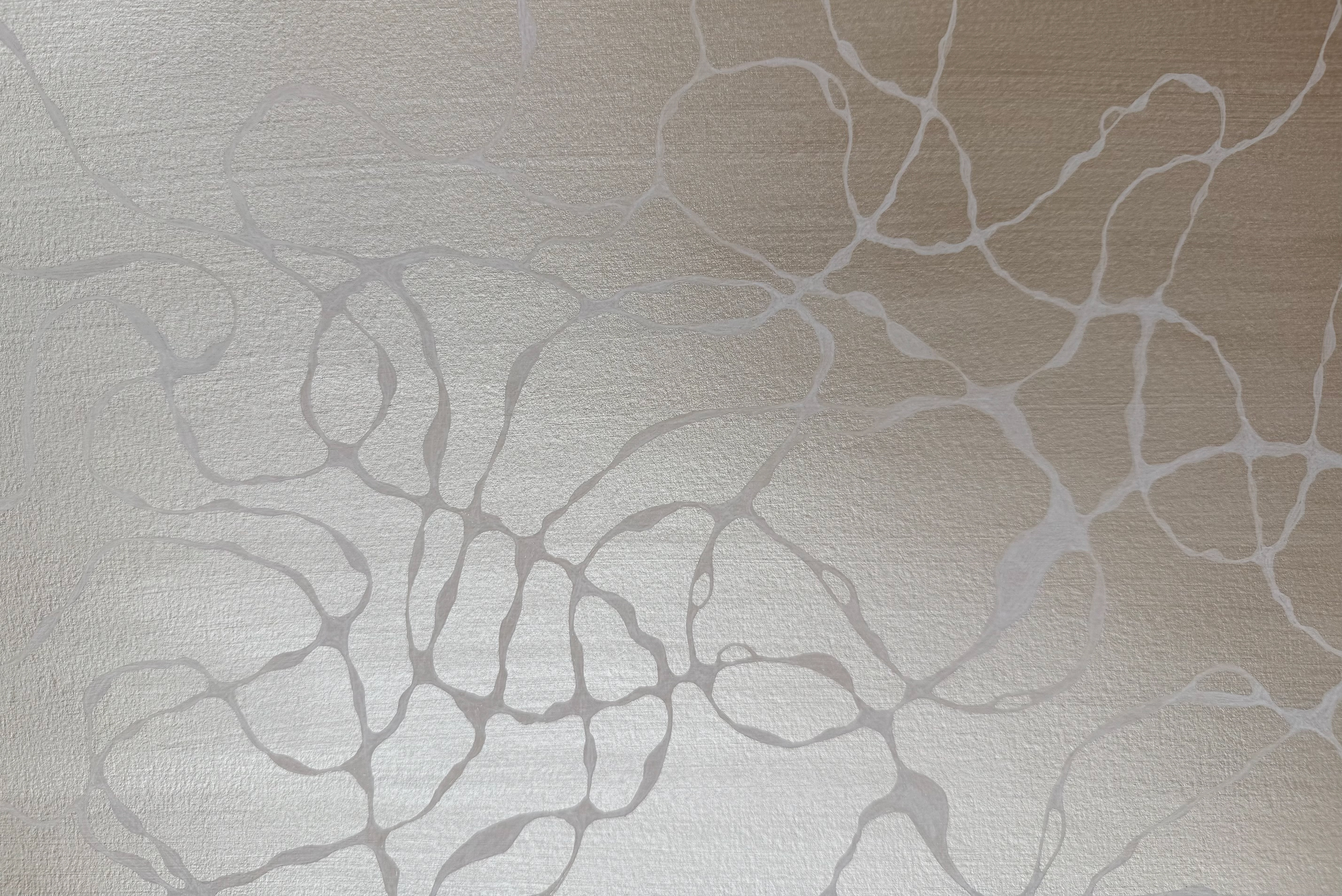 Medium: A play of iridescent gold and mother-of-pearl with white neuro-lines in acrylic on fine art paper
